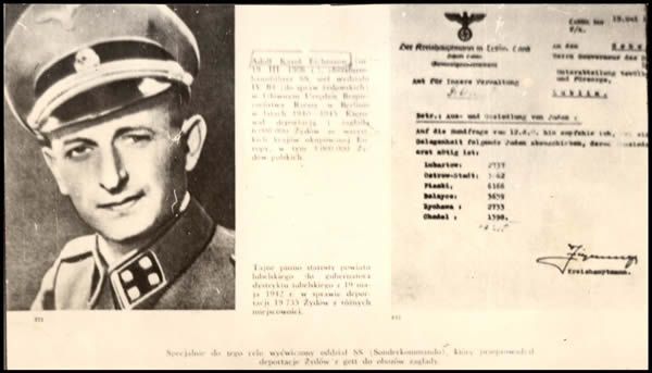 Voilà qui me donne beaucoup de satisfaction et de plaisir. » Son travail est remarqué et, en 1944, il est nommé en Hongrie pour organiser la déportation des Juifs et il envoie 400 000 Hongrois de toutes confessions dans les chambres à gaz nazies. En 1945, Heinrich Himmler, ministre de l'intérieur et Reichsführer SS, ordonne l'arrêt des exterminations et la destruction des preuves de la solution finale. Eichmann refuse les ordres et continue à déporter et à assassiner les Hongrois. Il s'efforce aussi d'éviter d'intégrer les unités combattantes, ayant été nommé un an auparavant Untersturmführer de réserve de la Waffen-SS. Eichmann fuit l'avancée soviétique et rejoint l'Autriche où il retrouve Ernst Kaltenbrunner. Durant les années 1950, de nombreux juifs s'emploient à retrouver les criminels nazis en fuite, et Eichmann fait partie des premiers sur la liste. Des documents déclassifiés montrent que le gouvernement ouest-allemand ainsi que la CIA connaissent, dès 1952 (1958 pour la CIA), le pseudonyme sous lequel se cache Eichmann (Klement), mais ne le révèlent pas pour raisons d'État. Il semble que la crainte ait été que Eichmann dénonce Hans Globke, alors membre du gouvernement du chancelier Konrad Adenauer.