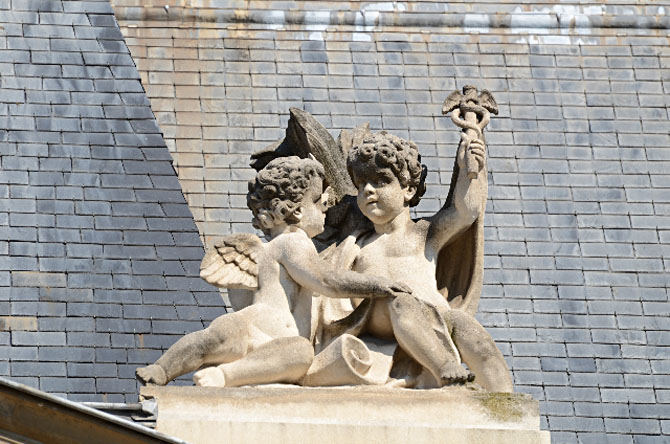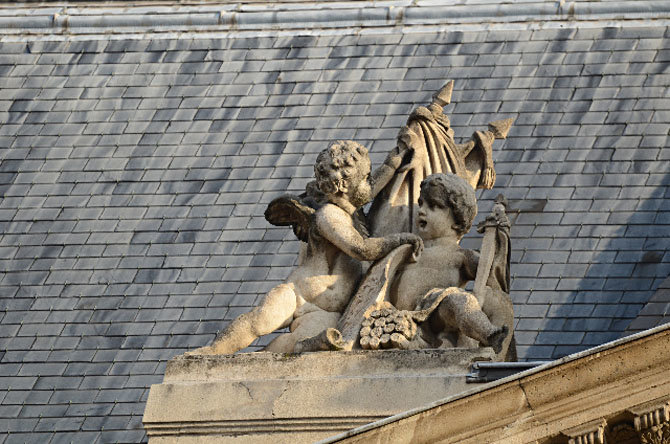 Angelots et cornes d'abondance sur le fronton de l'hôtel de Libéral Bruant.