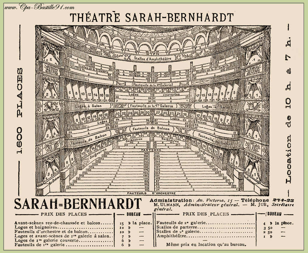 Mais il allait connaître une nouvelle période de sérénité avec la concession municipale en jouissance (le 11 janvier 1899) pour une durée de quinze ans, au profit de la grande tragédienne Sarah Bernhardt, qui finalement restera dans ce théâtre plus d’un quart de siècle, et lui donnera son nom.
